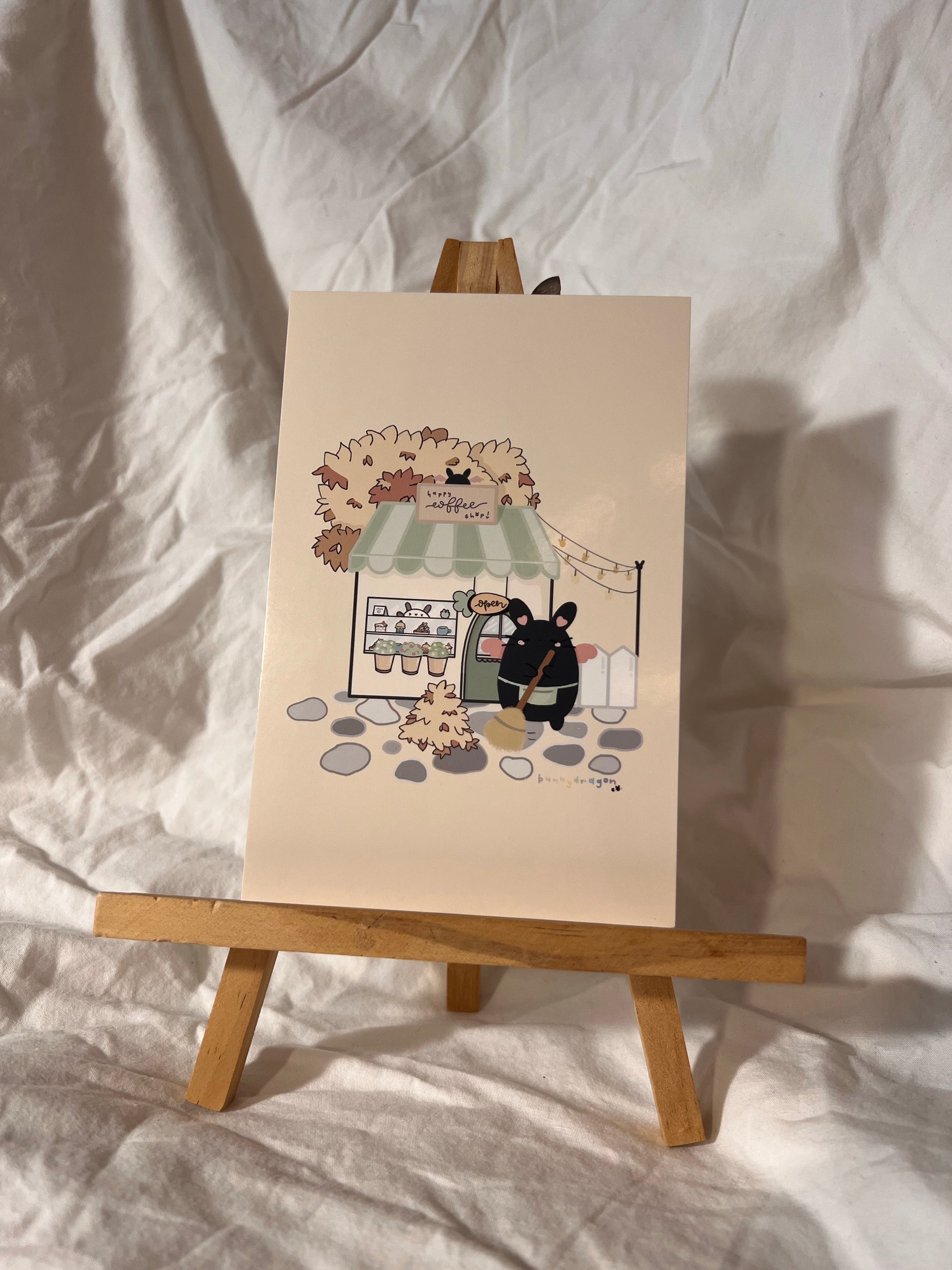 The bunnydragon tidies the front of the bunnydragon cafe.
